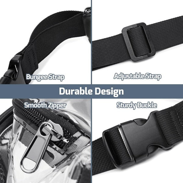 Clear Fanny Pack Stadium Approved - Clear Bag for Stadium Events Transparent Belt Bag for Women Men, Adjustable Waist Bag for Sports, Concerts, Black Waist Size Range - 19 to 47\" (48cm - 119cm) Includes the buckle and waist bag Stadium Approved Size - This clear stadium bag measures 11 x 3 x 5.9 inches, High Quality Material - 0.5 mm PVC