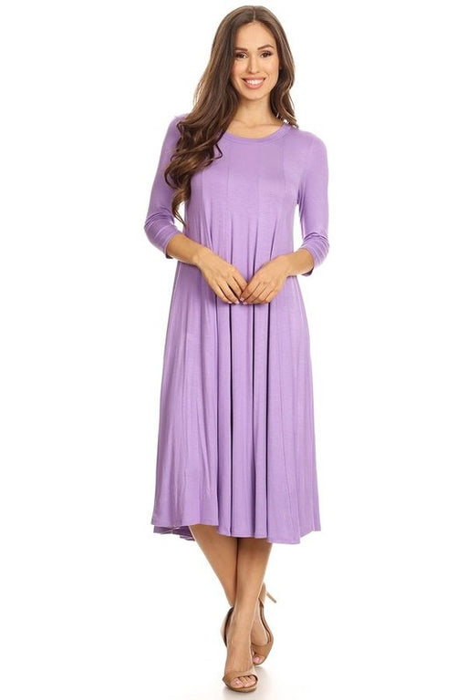 Moa CollectionSolid, 3/4 sleeve midi dress in a relaxed style with a scoop neck and pleated detailing-Variety of colors & style options available by searchin...