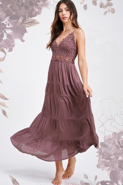 La MielThe Ollie Dress is the embodiment of bohemian charm, featuring a flowing maxi silhouette adorned with intricate crochet lace trim that gracefully a...
