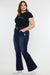 Introducing our Plus High Rise Double WB Fray Hem Flare Jeans, the perfect blend of style and comfort for your denim collection. Crafted in a dark stone wash with stretch denim, these jeans offer a flattering and flexible fit that hugs your curves in all the right places. The distressed detailing adds a touch of edgy flair, while the two-button zip fly closure ensures a secure and comfortable fit. The fray hem and flare leg silhouette create a trendy and retro-inspired look that's perfect for any occasion.