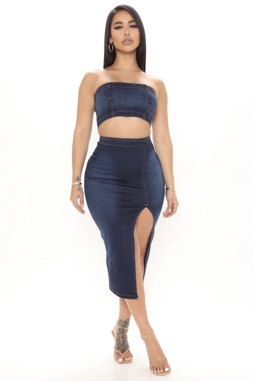 GJG DenimDenim Skirt set features pencil denim skirt with front slit and back button and zipper closure. Denim Top features back zipper closure, Stretch Den...