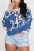 Key Features: Eye-Catching Geometric Pattern: Stand out with a unique geometric pattern featuring triangles and diamonds in a harmonious blend of blue, white, and black hues. Distressed Elegance: Embrace the trendy distressed look with frayed edges and cut out star details, adding an edgy touch to your ensemble. Cropped Style: Flaunt a contemporary silhouette as the sweater sits above the waist, allowing you to pair it effortlessly with high-waisted bottoms for a chic look. Star Sleeve Detail: The star cutout sleeves add a playful and fashionable element, making this knit denim top truly one-of-a-kind. Versatile and stylish, our STAR SLEEVE KNIT DENIM CONTRAST TOP is perfect for making a bold statement on casual outings or adding flair to your everyday look. Embrace the intersection of comfort and fashion with this must-have sweater.