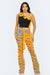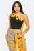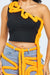 Asymmetric Cutout Crop Top with Contrast Piping, This top has a sleek, one-shoulder design that creates a bold silhouette. The contrast piping in a vibrant orange hue adds a playful and artistic touch, tracing along the edge and cascading down in looping swirls, which adds a sense of movement and an avant-garde feel. The black fabric serves as a stark canvas for the orange detail, making it pop and giving it a modern edge. This crop top could appeal to a fashion-forward demographic that enjoys statement pieces with unique detailing. It's a garment that could be paired with casual or upscale attire, making it versatile for various occasions.