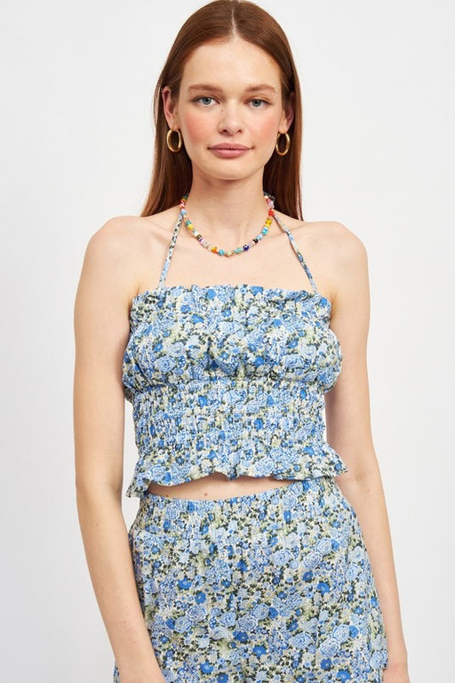HALTER NECK FLORAL CROP TOP WITH BACK SMOCKING