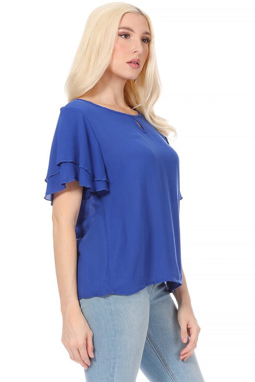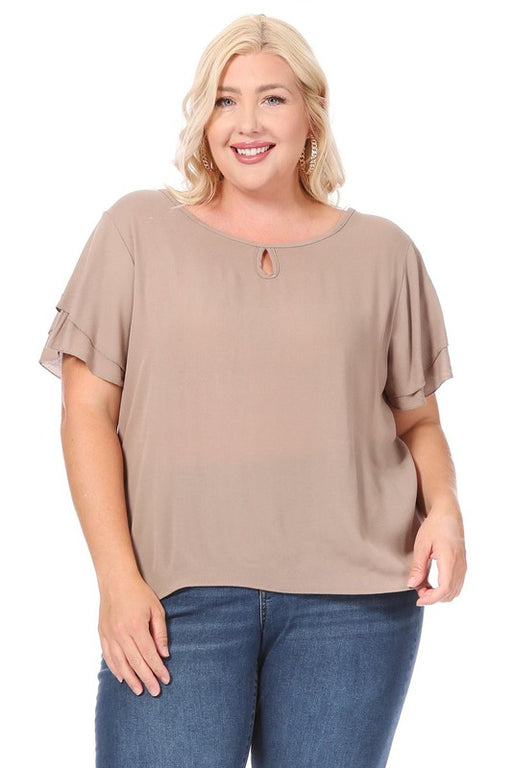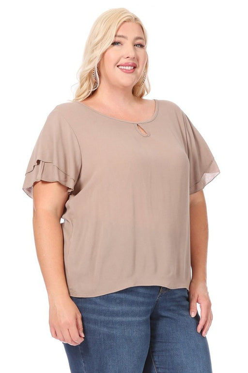 Moa CollectionPlus size, short flutter sleeve round neck keyhole blouse.Approx: Length: 25 in, Bust: 44 in, Sleeve: 9.5 in, Shoulder: 19 in Model is wearing a si...