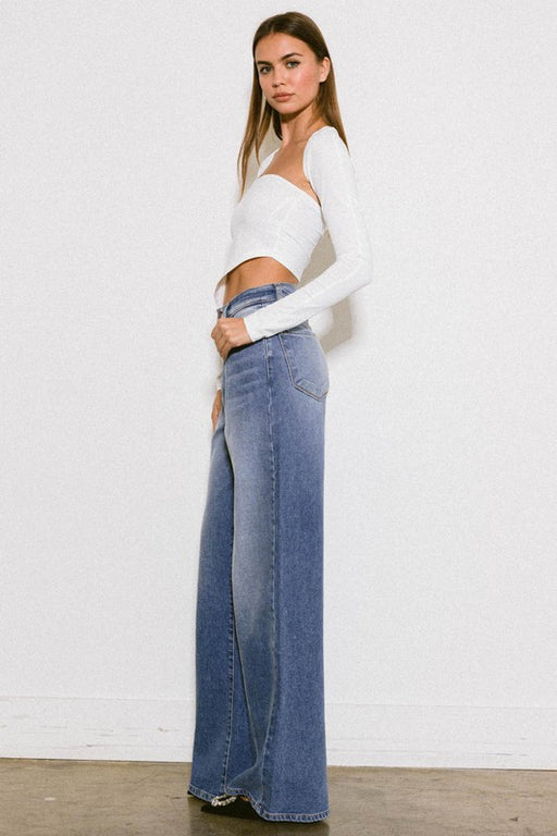 Vibrant M.i.UElevate your denim game with our High Rise Center Line Wide Jeans. These jeans are designed to make a statement with their high-rise fit and unique...