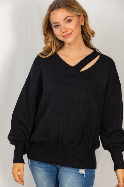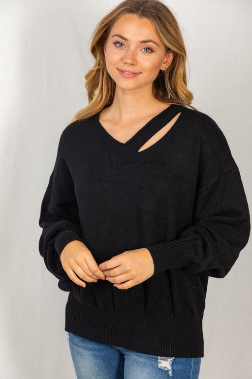 White BirchA long sleeve solid knit sweater with a v-neck featuring a front cutout and a tapered waist. Fabric is a medium weight sweater knit.Model is 5'7" a...