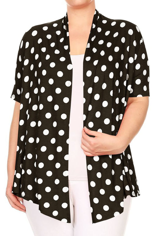 Moa CollectionPolka dot print, loose fit cardigan with an open front, short sleeves, and asymmetrical hem.Approx: Length: 34in, Bust: 44in, Sleeve: 7.5in, Should...