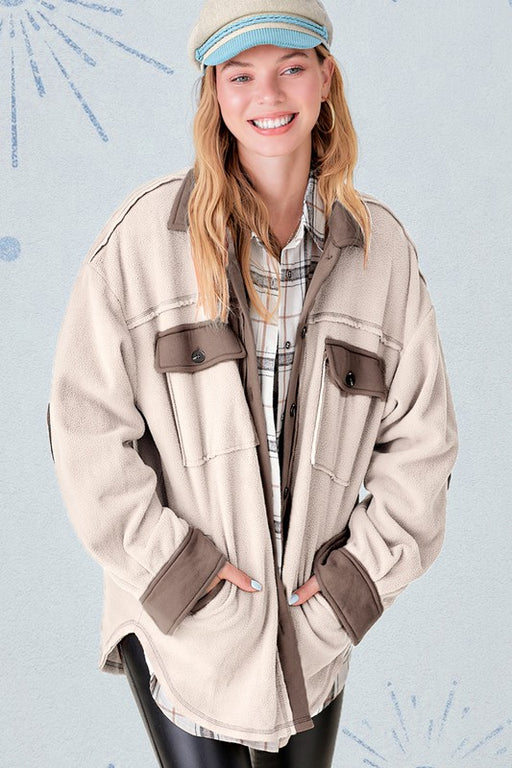Orange Farm ClothingOversized, reversed stitched mixed media shacket with elbow patch and front pockets. Mocha Leopard and Burgundy Leopard is with soft sweater knit. ...