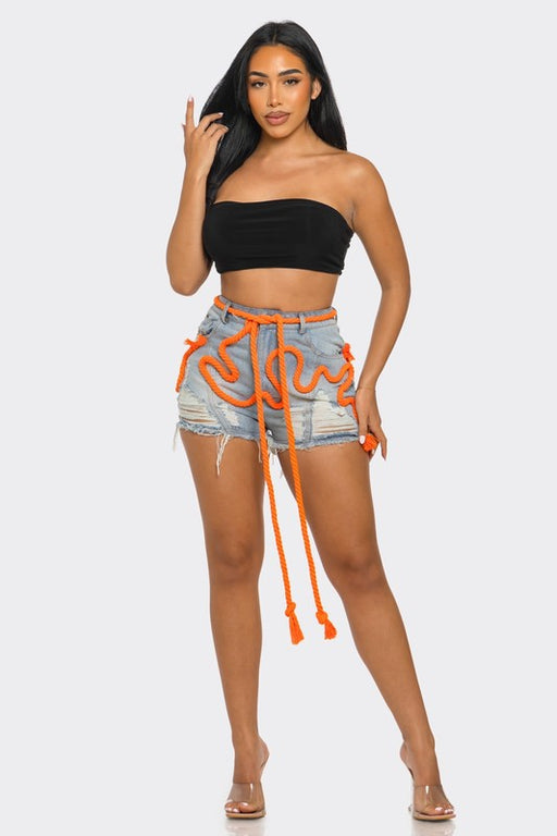 View full detailsPlayful Denim Shorts With Orange Drawstring