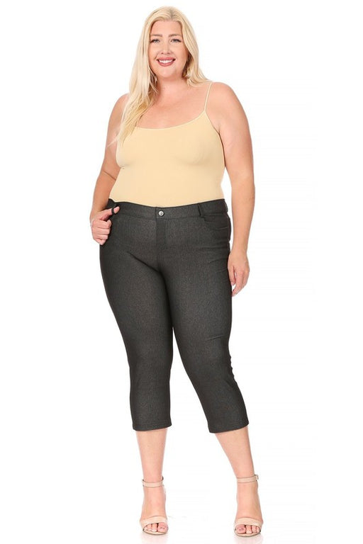 Moa CollectionPlus size, stretchy, pull up, capri jeggings with belt loops, pockets, and button accentApprox Length: 31 in from waist to hem, Waist: 38 inModel i...