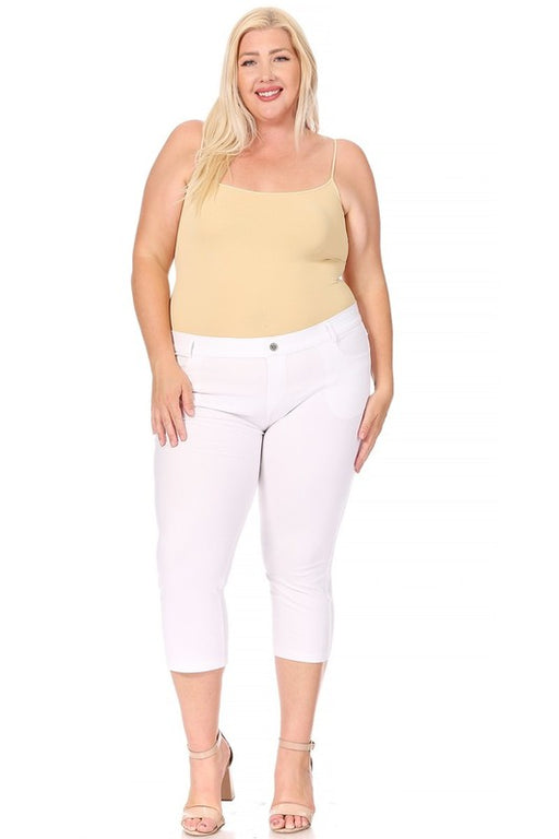 Moa CollectionPlus size, stretchy, pull up, capri jeggings with belt loops, pockets, and button accentApprox Length: 31 in from waist to hem, Waist: 38 inModel i...