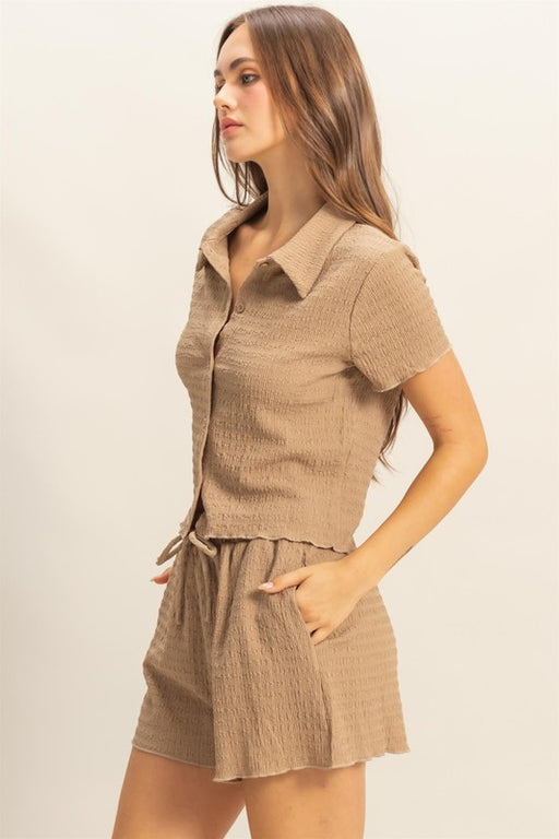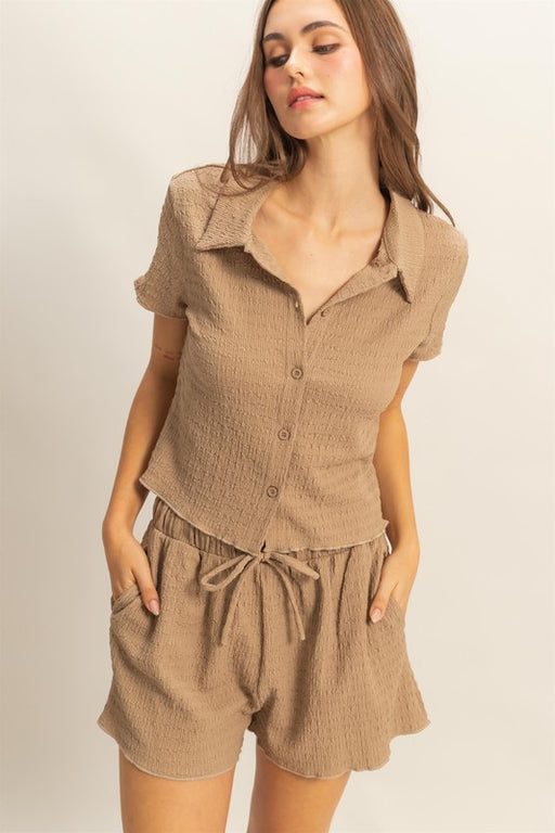 View full detailsHYFVE Textured Short Sleeve Top and Drawstring Shorts Knit Set