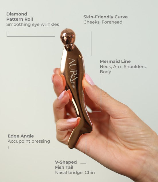 How to Use: On clean skin, apply a small amount of face cream or serum of your choice. Gently move the contour edge across your jawline, cheeks, under-eye areas, and forehead. Use Aura Edge Roller back and forth under your eyes, temples, cheeks, and jawline. TIP: For a cooling and tightening effect, store the Aura Edge in the fridge before use. When done, wipe, clean, and store in the included pouch!