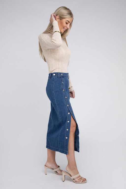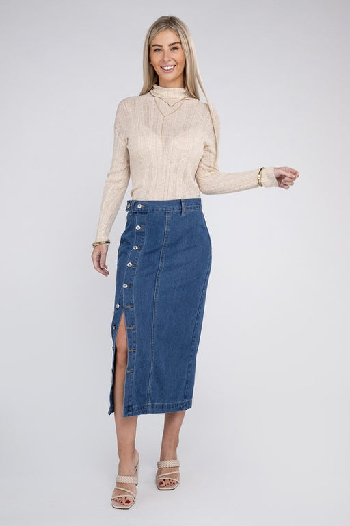 Miss SparklingDistressed denim midi skirtOpen slit in frontDistressing on back pocketsMade In: China