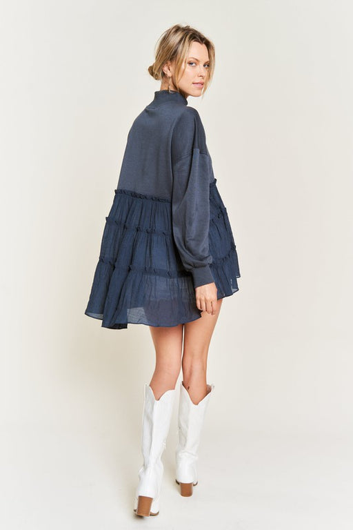 Jade By Jane-Mock neck tunic top-Woven fabric at bottom tier shirring-Drop shoulder-Ribbed trim-Oversized-SELF : 95%POLY 5%SPAN / CONTRAST : 65%COTTON 35%POLY-...