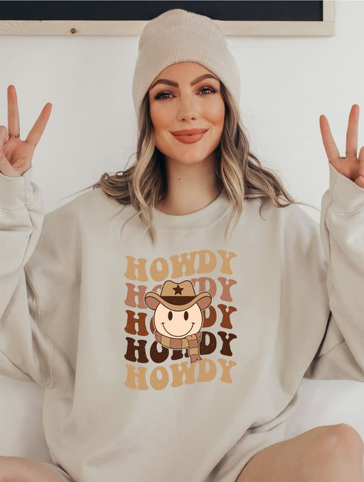 Stacked Howdy Cowboy Smile Sweatshirt8.0 oz. pre-shrunk fleece50% cotton / 50% polyester