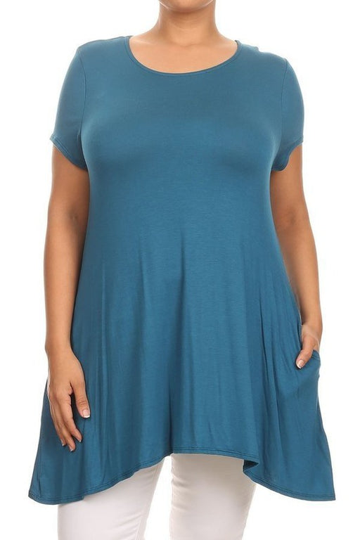 Moa CollectionSolid, tunic top in a loose fit with a round neck, short sleeves, a slight curved hem, and side pockets.Approx: Length: 30.5 in, Bust: 40 in, Sleev...