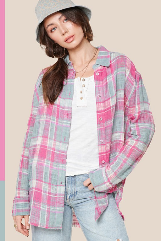 La MielOne of our best selling products!Button down shirt with bold plaid print. Relaxed fit with long sleeves. Cut edge detailing for hand cuffs and raw ...