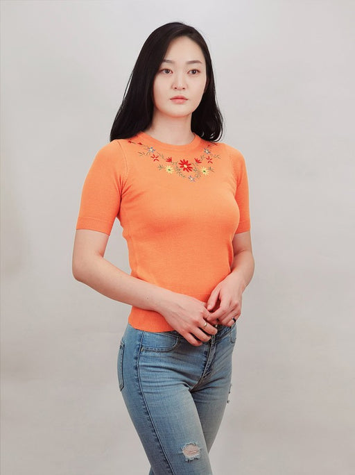 - 21"-22" Length, 1/2 Sleeves, Slim-Fit, Colorful, Boutique, Daisy Flower Embroidered, Knit Pullover Sweater.- Various Vivid Color Choices with Siz...