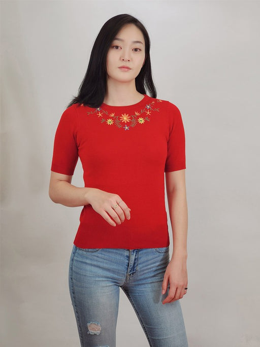 Mak- 21"-22" Length, 1/2 Sleeves, Slim-Fit, Colorful, Boutique, Daisy Flower Embroidered, Knit Pullover Sweater.- Various Vivid Color Choices with Siz...