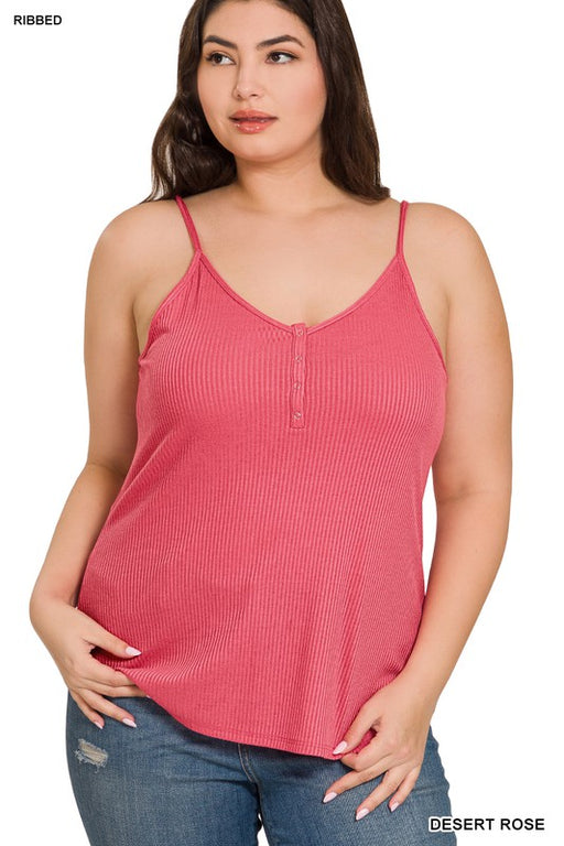 ZENANAThe Plus Ribbed Half Snap Button Closure Cami Top is a versatile and stylish addition to your wardrobe. Its ribbed texture adds a touch of sophisti...