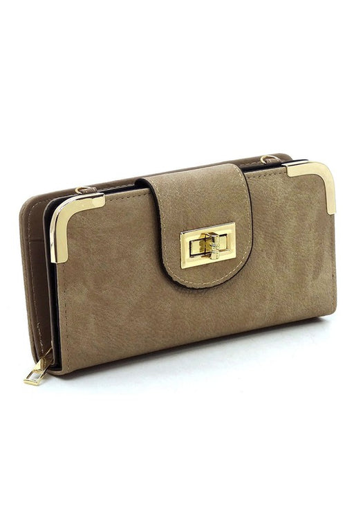 Fashion Turn Lock Crossbody WalletFaux vegan leatherTurn-lock & Zip closureGold-tone hardwareDetachable chain shoulder strapL 7.75 * H 4 * W 1.25