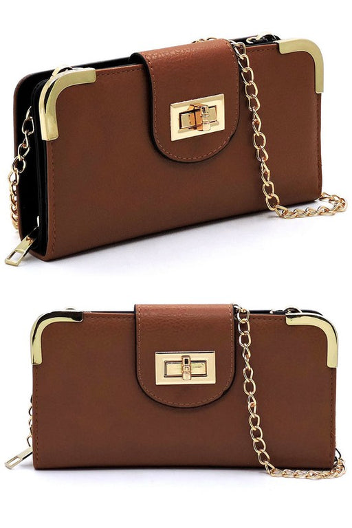Fashion Turn Lock Crossbody WalletFaux vegan leatherTurn-lock & Zip closureGold-tone hardwareDetachable chain shoulder strapL 7.75 * H 4 * W 1.25