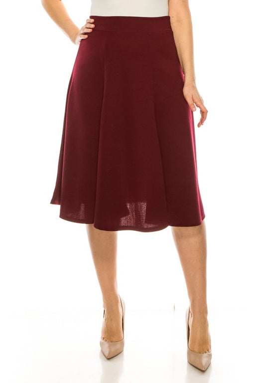 Moa CollectionPlus size, solid, high waisted, A-line, midi skirt with elastic waist.Approx Length: 39 in from waist to hem. Waist: 31 inModel is wearing a size X...