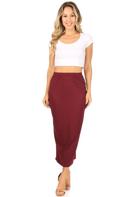 Moa CollectionSolid midi skirt in a pencil silhouette with high waist and back slit.Approx: Length: 34.5 in, Waist: 32 inModel is wearing a size XLMade In: USAFa...