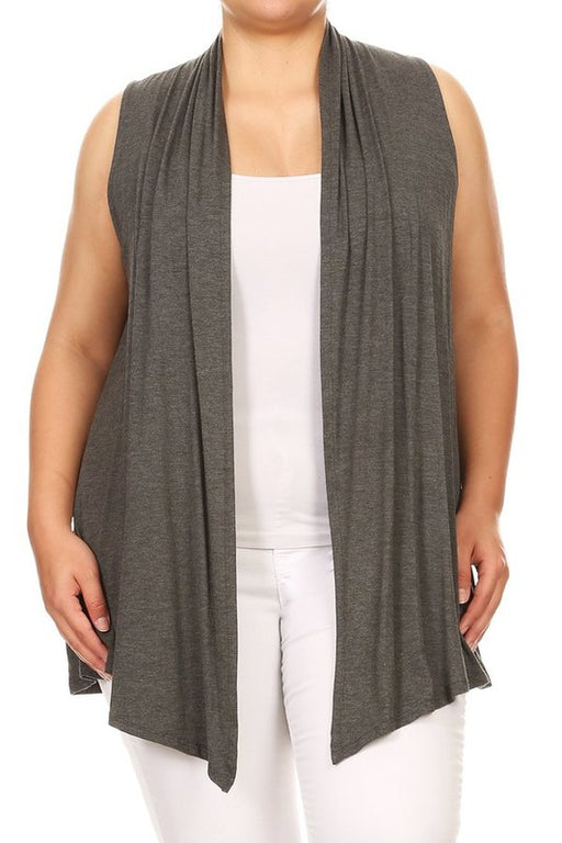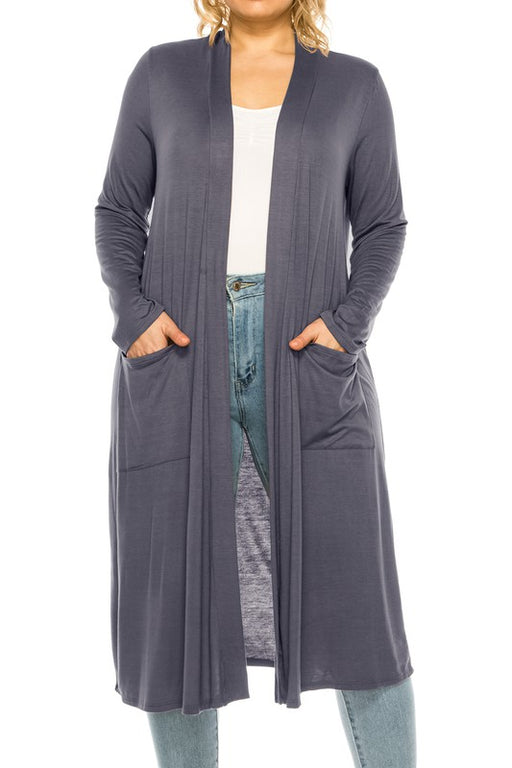Moa CollectionPlus size, solid duster cardigan in a loose fit with an open front, long sleeves, and side pockets.Approx: Length: 46in, Bust: 44in, Sleeve: 25in, ...