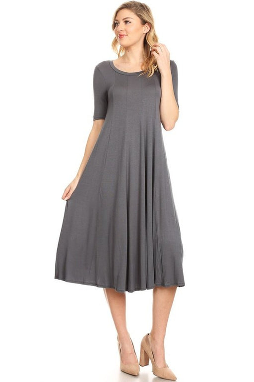 Moa CollectionSolid jersey knit a-line dress with paneled detail, round neckline, and 3/4 sleevesFull length:Approx 43 inBust:Approx 31 inShoulder:Approx 16 inSl...