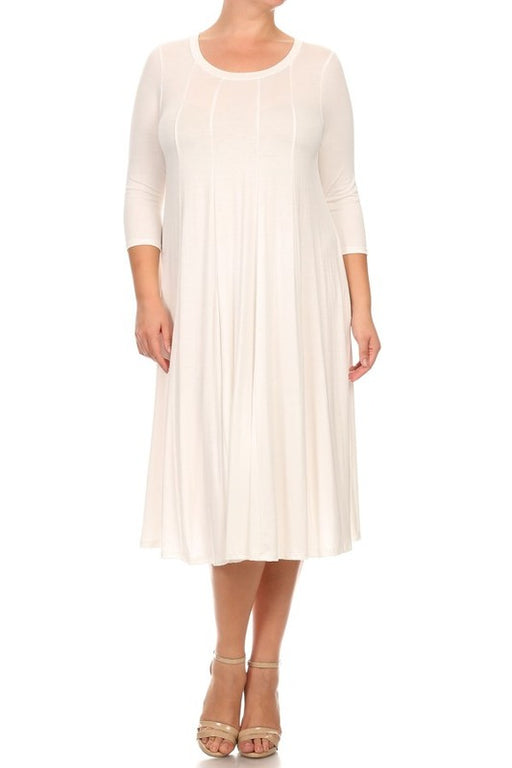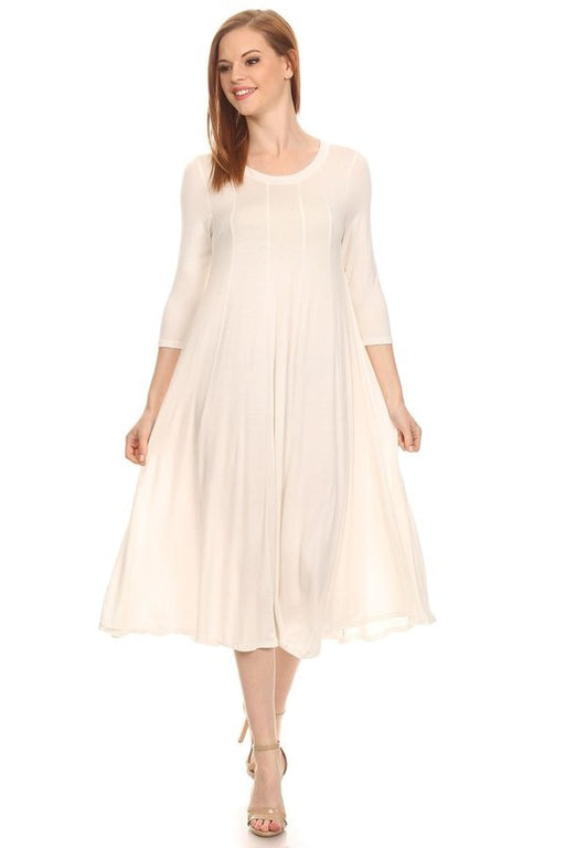 Moa CollectionSolid, 3/4 sleeve midi dress in a relaxed style with a scoop neck and pleated detailing-Variety of colors & style options available by searchin...
