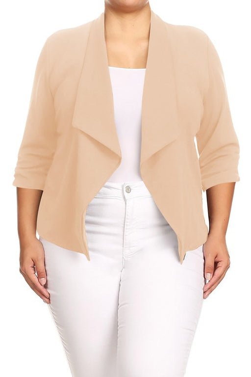 Moa CollectionPlus size, solid, waist length, collarless blazer cardigan with an open front and 3/4 length, cuffed sleevesApprox: Length: 21 in, Sleeve: 18.5 in,...