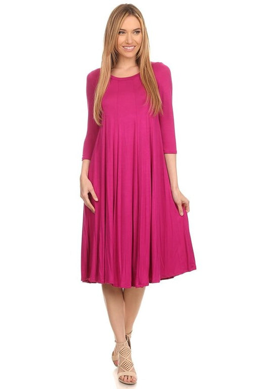 Moa CollectionSolid, 3/4 sleeve midi dress in a relaxed style with a scoop neck and pleated detailing-Variety of colors & style options available by searchin...