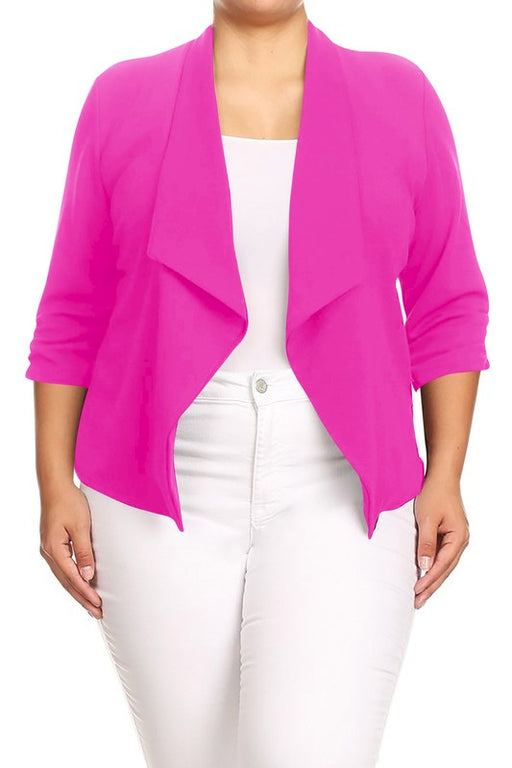 Moa CollectionPlus size, solid, waist length, collarless blazer cardigan with an open front and 3/4 length, cuffed sleevesApprox: Length: 21 in, Sleeve: 18.5 in,...