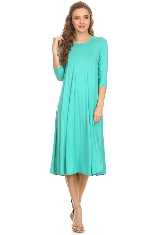 Moa CollectionSolid jersey knit a-line dress with paneled detail, round neckline, and 3/4 sleevesFull length:Approx 43 inBust:Approx 31 inShoulder:Approx 16 inSl...