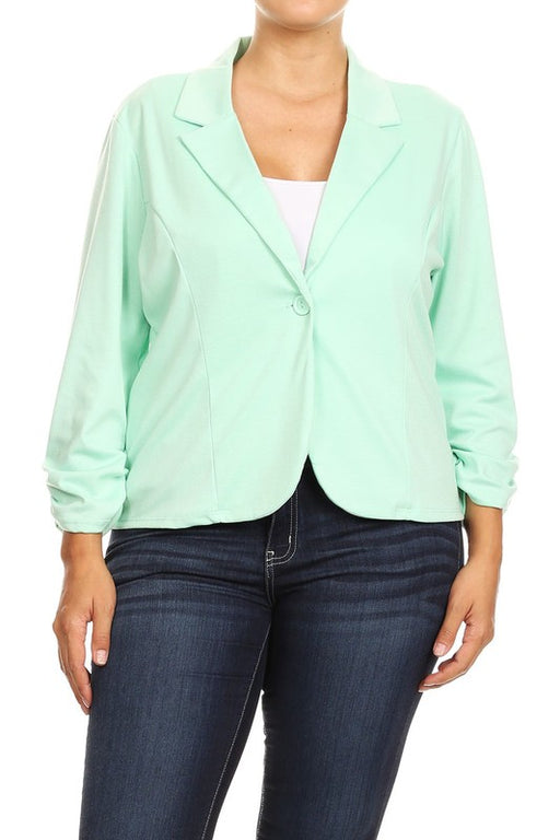 Moa CollectionSolid, waist length blazer in a fitted style, with a button closure, and ruched sleeves.Approx: Length: 25in, Bust: 43in, Sleeve: 20in, Shoulder: 2...