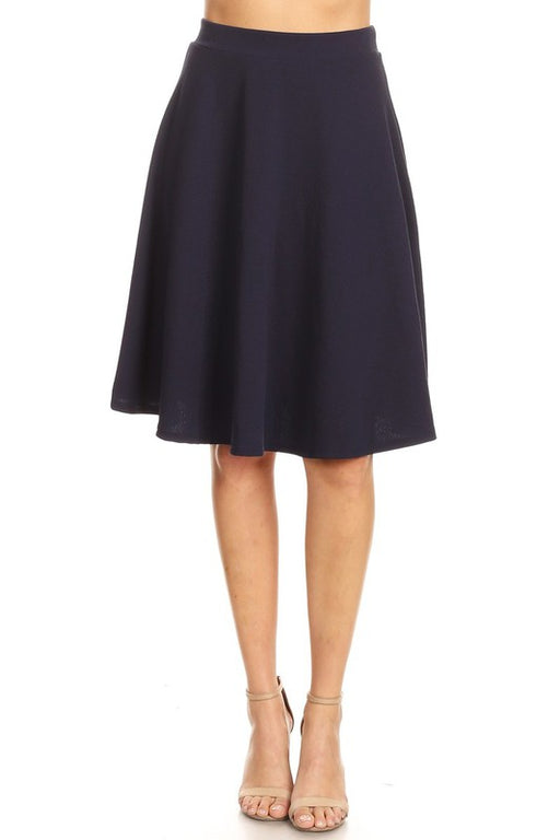 Moa CollectionSolid, high waisted, A-line, knee length skirt with elastic waist.Approx Length: 25 in from waist to hem. Waist: 32 inModel is wearing a size XLMad...