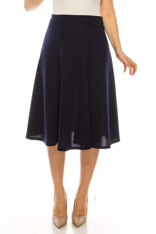 Moa CollectionPlus size, solid, high waisted, A-line, midi skirt with elastic waist.Approx Length: 39 in from waist to hem. Waist: 31 inModel is wearing a size X...