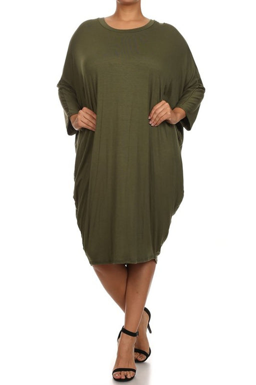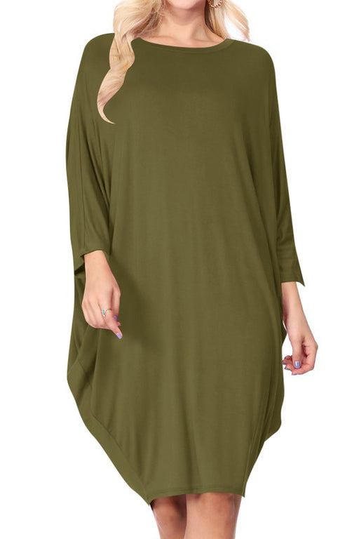 Moa CollectionSolid dolman dress with round neckline and 3/4 sleevesApprox: Length: 42 inRAYON SPANDEXMade In: USAFabric Contents: 95%RAYON 5%SPANDEX