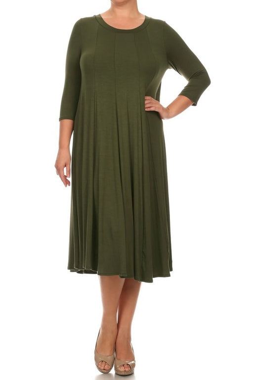 Moa CollectionSolid, 3/4 sleeve midi dress in a relaxed style with a scoop neck and pleated detailing-Variety of colors & style options available by searchin...