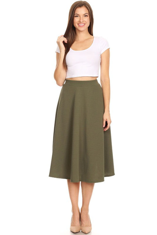 Moa CollectionSolid high waisted, A-line, midi skirt with elastic waist.Approx Length: 30in from waist to hem. Waist: 24.5inModel is wearing a size small-Continu...