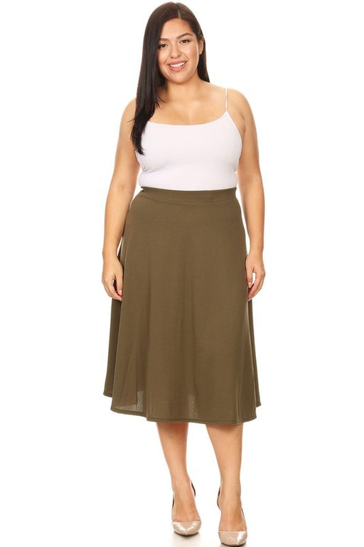 Moa CollectionSolid high waisted, A-line, midi skirt with elastic waist.Approx Length: 31.5in from waist to hem. Waist: 32inModel is wearing a size XL-Continuous...