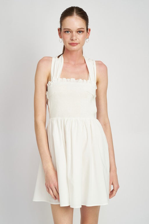 View full detailsBOW TIE BACK SMOCKED MNI DRESS