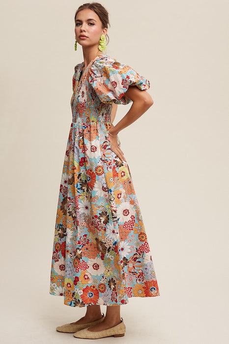 The Flower Print Smocked V-Neck Puff Sleeve Poplin Maxi Dress exudes charm and elegance with its delightful features. Its V-neckline adds a touch of sophistication, while the smocked detailing on the top provides a flattering and comfortable fit. The puff sleeves, with elastic cuffs, add a romantic flair to the ensemble. Hidden side seam pockets offer practicality without compromising style.
