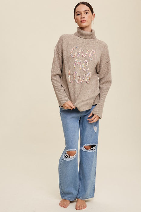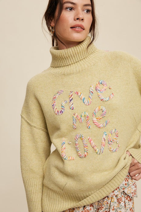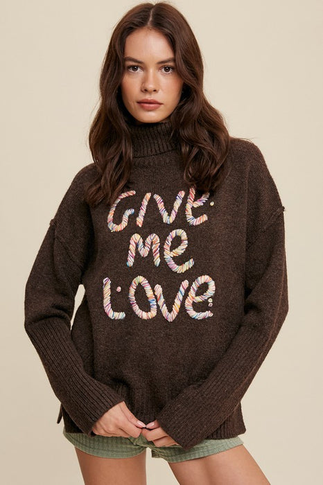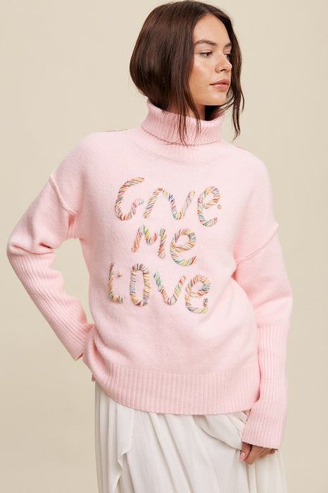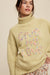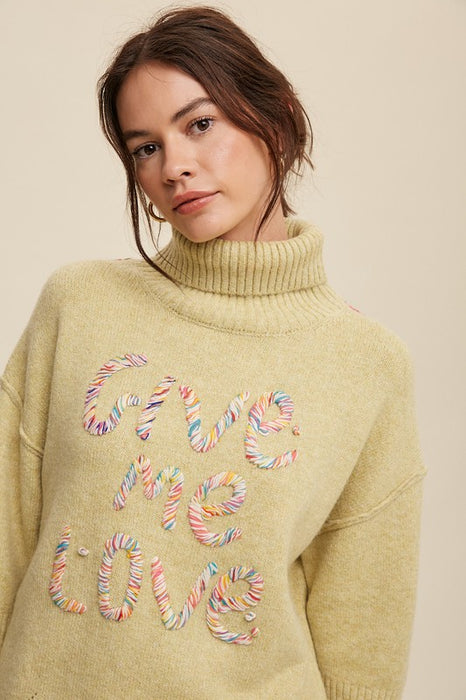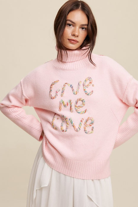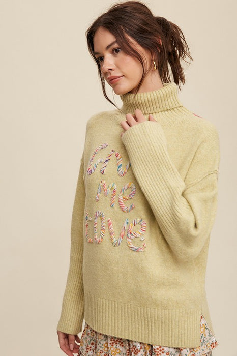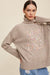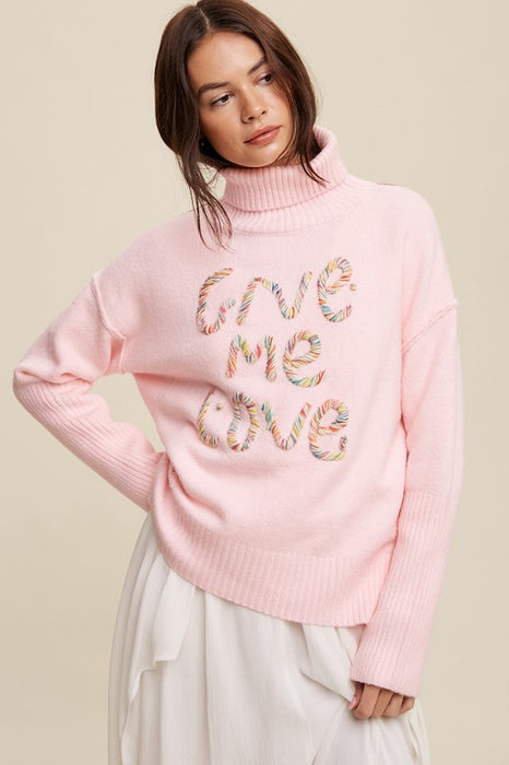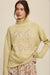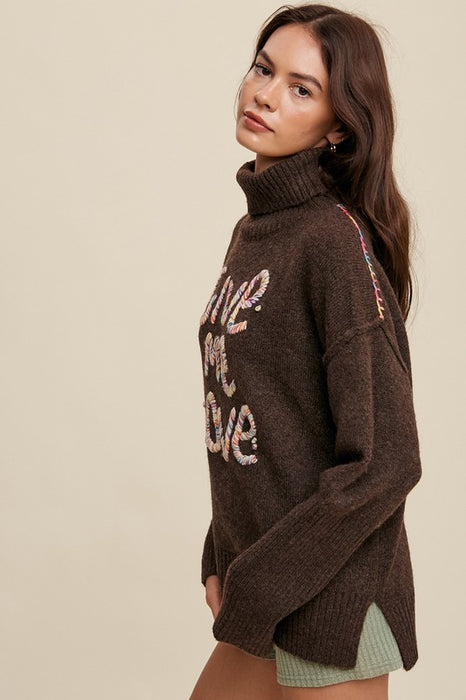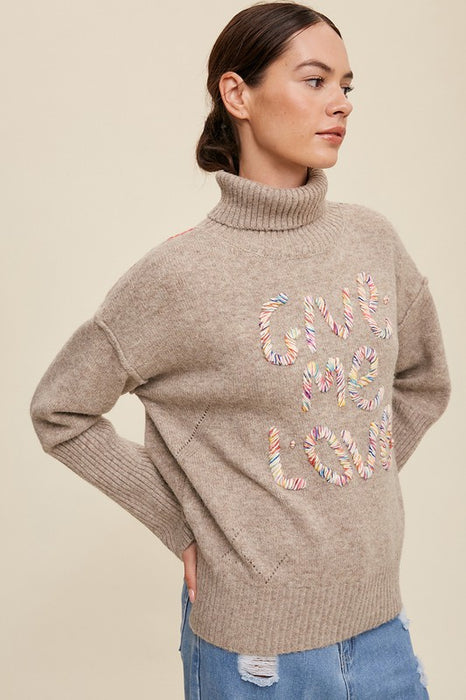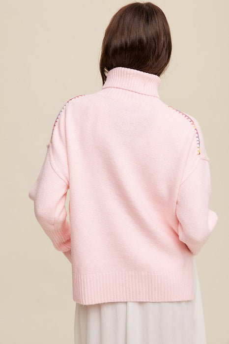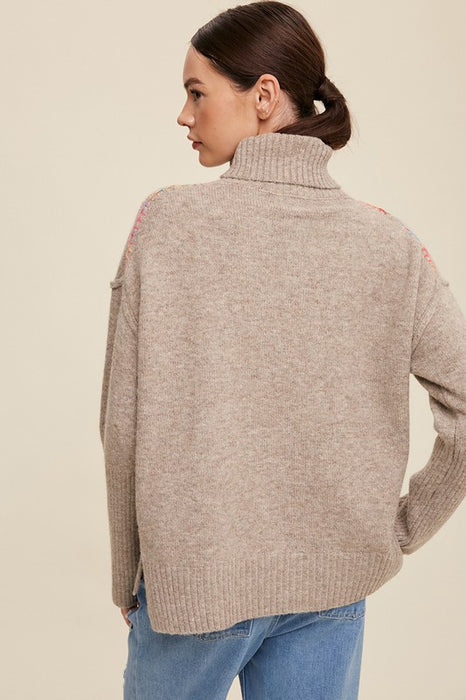 A cozy and stylish addition to your winter wardrobe. This sweater combines comfort with a pop of color, featuring long sleeves, a mock neck, and intricate multi-color stitching detail on the shoulders.