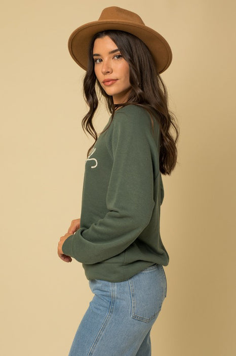 -Style: Casual Western Charm -Feature: Playful Graphic Print -Print/ Pattern: "Howdy" Text Design -Neckline: Round Neck -Silhouette: Relaxed -Embellishment: None -Length: Hip-Length -Sleeve: Long Sleeves -Fit: Comfortable -Closure: Pullover -Lining: Unlined -Care Instruction: Machine wash cold, gentle cycle, tumble dry low. *Color may vary slightly due to monitor resolution.
