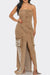 The Distressed Cargo Maxi Dress features a strapless design that combines rugged utility with chic sophistication. Made from durable, tan-colored fabric, this dress highlights a structured bodice with a front seam detail. The dress is characterized by its two large cargo pockets on the sides, enhancing the utilitarian aesthetic. The fabric shows significant distressing, particularly around the pockets, adding a grunge touch to the overall look. A front slit adds a touch of femininity and ease of movement, making this dress a versatile piece for both casual outings and stylish evening events.